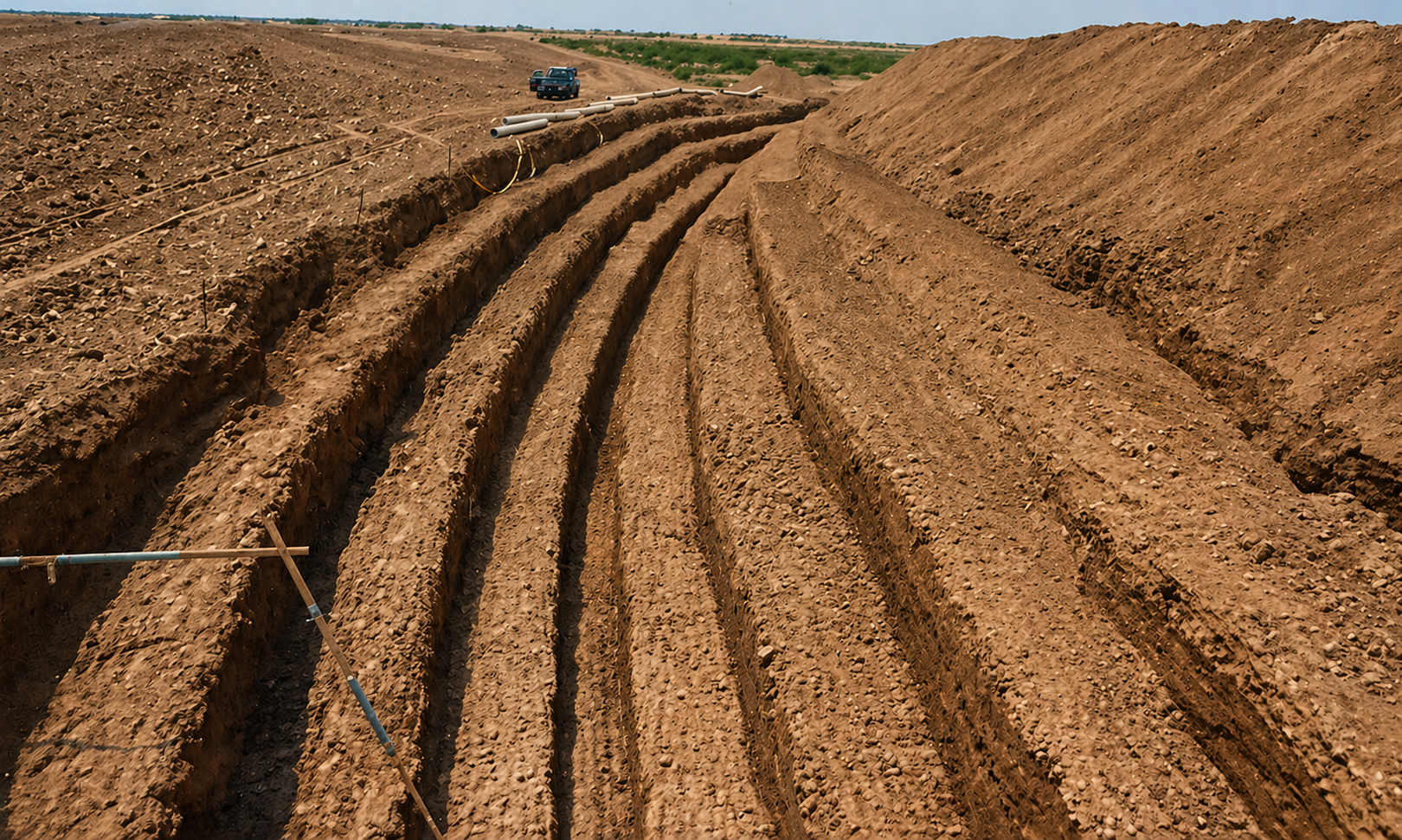 Installation of vitrified clay pipe (VCP) sanitary sewer system including trench excavation, bedding preparation, and precision alignment. Image highlights uniform joint spacing, proper pipe grade, and quality control during installation to ensure long-term system performance.